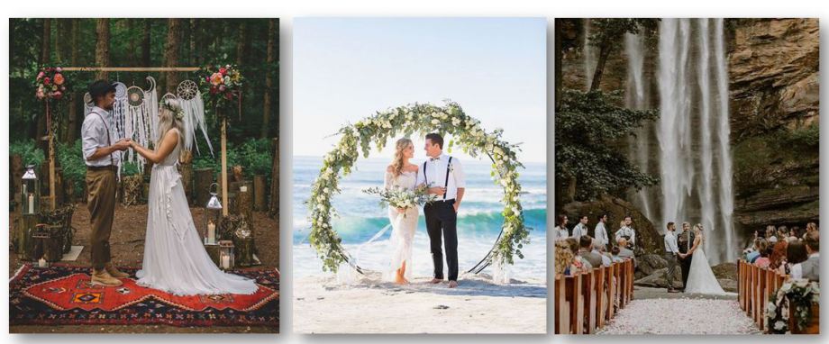 Ein besonderes Dekohighlight bei freien Trauungen ist der Traubogen, der als Hintergrund dient. Ein Traubogen kann aus Holz, Metall oder ähnlichen sein und kann mit Stoffbahnen, Blumen, Pompoms, Vorhänge oder Wimpelketten dekoriert werden.