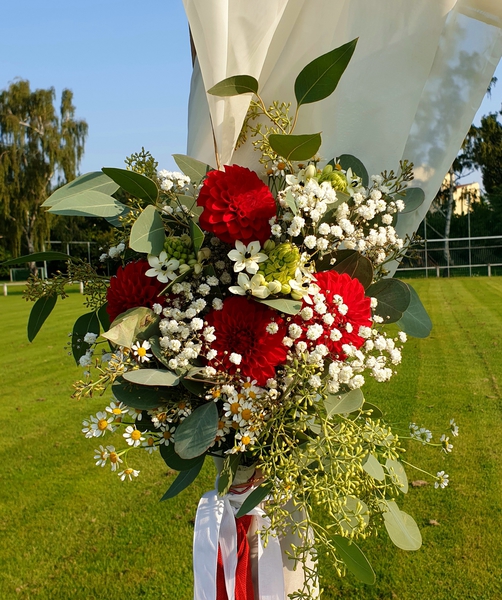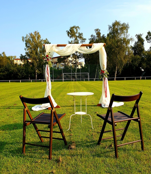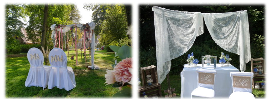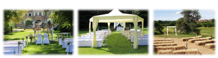 Ihr könnt links und rechts zum Beispiel Stühle, Bierzeltgarnituren, Strohballen oder ähnliches zum Sitzen für eure Gäste aufbauen und in der Mitte einen Gang lassen, in dem dann die Braut oder ihr gemeinsam einlaufen könnt. Den Mittelgang könnt ihr mit Blumen, Stäben, Windlichtern, Laternen, etc. schmücken. Auf die Sitzgelegenheiten für eure Gäste könnt ihr z. B. einen Ablaufplan, einen Fächer, Taschentücher für Freudentränen oder Seifenblasen legen.